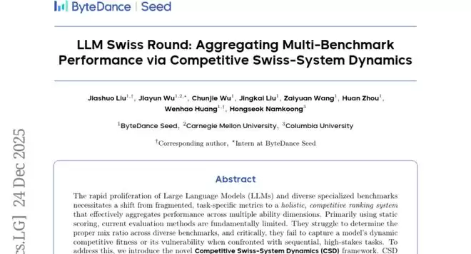 这正是ByteDance Seed团队、卡内基梅隆大学和哥伦比亚大学的研究人员在2024年12月发表的这项研究要解决的核心问题。这篇题为《LLM Swiss Round: Aggregating Multi-Benchmark Performance via Competitive Swiss-System Dynamics》的论文可以通过arXiv编号2512.21010v1查询到完整内容。研究团队的核心成员包括刘佳硕、吴嘉赟、吴春杰等来自ByteDance Seed的研究人员,以及哥伦比亚大学的洪石南教授。
