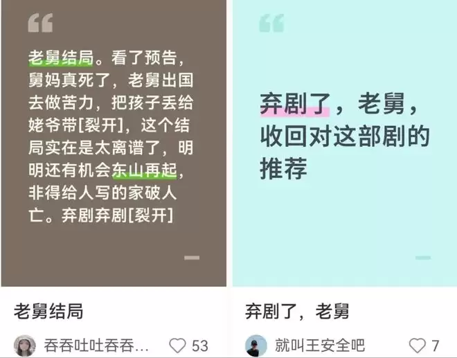 真是一波未平一波又起,这些糟心的剧情观众都忍了,但最忍不了的是,真把观众最喜爱的舅妈李小珍给写死了,还是车祸去世,意难平!不接受!弹幕也是骂声一片,舅妈去世就不想看了,想给编剧寄刀片,怎么把舅妈写死了?观众都不理解。