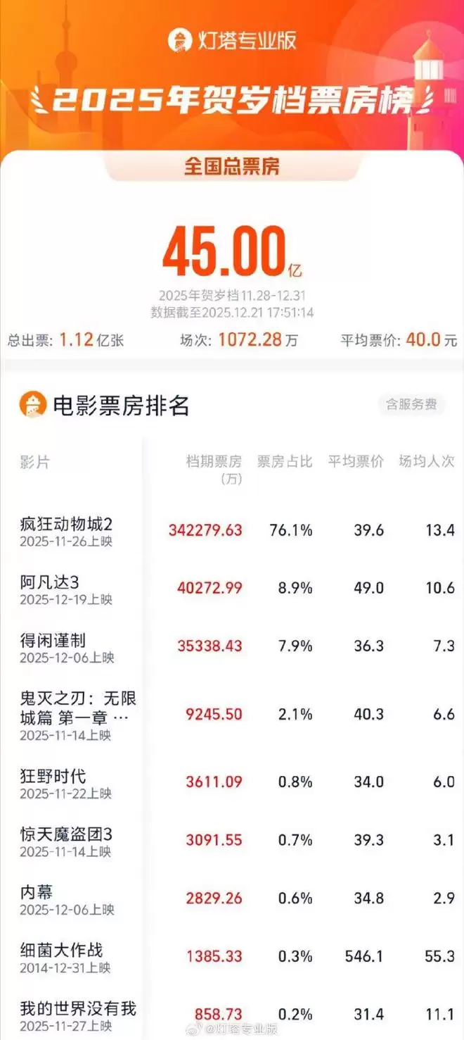 根据灯塔专业版的数据,截至12月21日17时51分,2025年贺岁档(11月28日至12月31日)全国总票房(含预售)已突破45亿元大关。