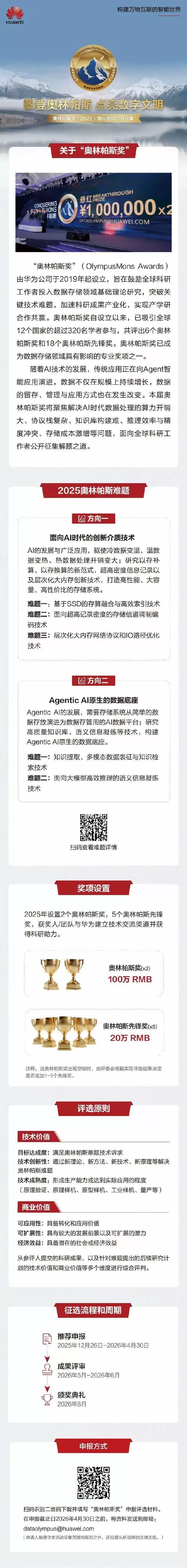 12月26日,@华为中国 官方宣布,备受全球数据存储领域瞩目的第六届“奥林帕斯奖”全球征集正式启动,诚邀全球科研人员积极参与,共同挑战并突破数据存储领域的关键技术难题。