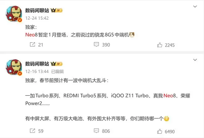 此前,数码博主@数码闲聊站 在本月早些时候爆料称,“春节前将有一波中端机大乱斗”,涉及一加、红米、真我、荣耀等品牌。其中,真我 Neo8 暂定1月登场,或将搭载骁龙 8 Gen5处理器并配备一块超过8000mAh的超大电池。另有传闻称,该手机将搭载一块约6.78英寸的1.5K分辨率LTPS直面屏,支持最高165Hz刷新率,屏幕供应商来自三星。