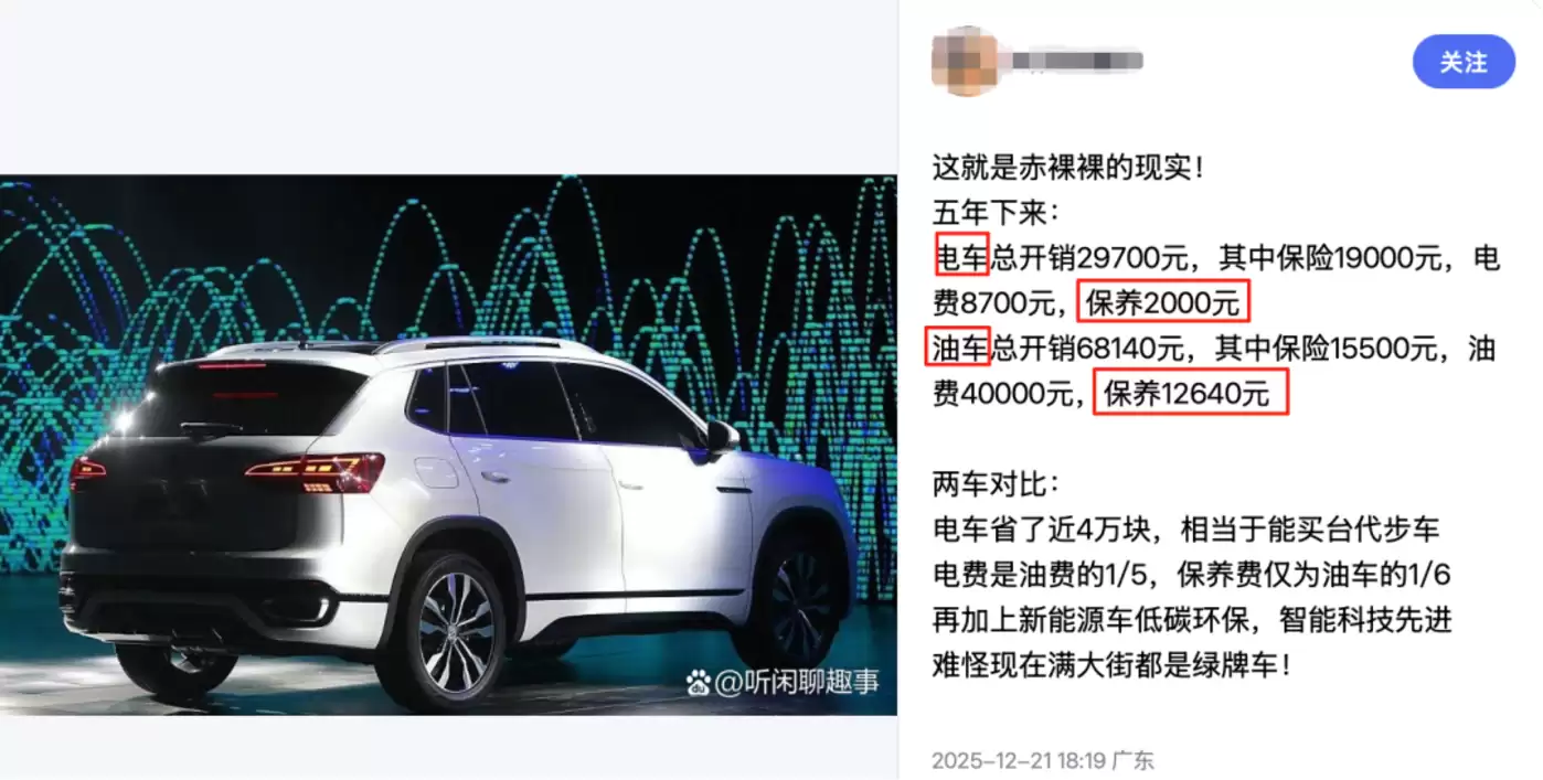 图/某车主5年油车电车保养费对比来源/互联网 新能源观截图