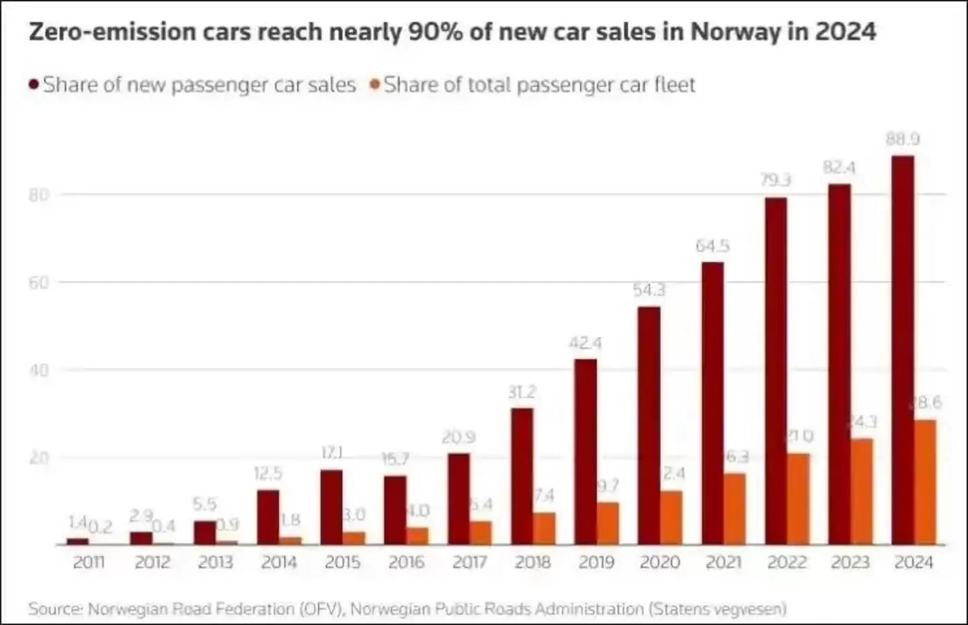 图/零排放汽车占挪威新车销量比例来源/互联网 新能源观截图