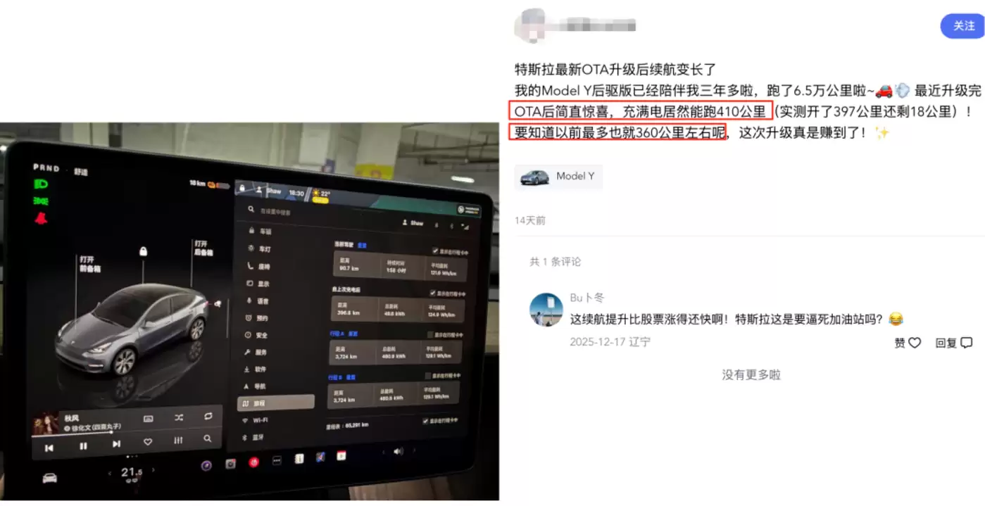 图/某特斯拉车主分享OTA升级后续航增加 来源/互联网 新能源观截图