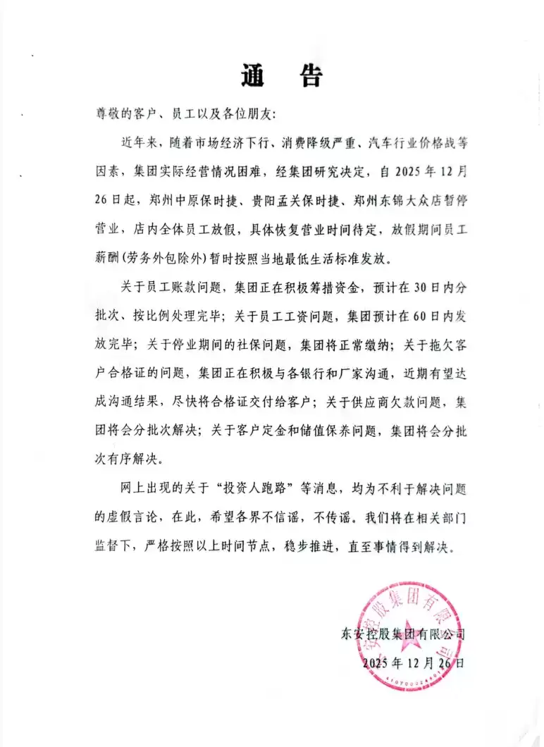 近年来,受市场下行、消费降级明显以及汽车行业价格竞争加剧等多重因素影响,集团实际经营面临较大压力。经集团研究决定,自12月26日起,旗下郑州中原保时捷中心、贵阳孟关保时捷中心及郑州东锦大众店将暂停营业。门店全体员工将进入放假状态,具体恢复营业时间待定。放假期间,员工薪资(劳务外包除外)将暂时按当地最低生活保障标准发放。