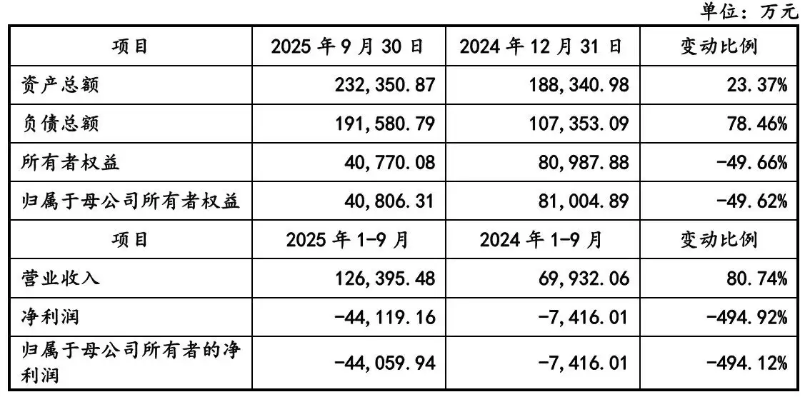 2025年前九个月,公司营业收入增至12.64亿元,较上年同期的7亿元大幅增长80.74%;净亏损为4.42亿元,扣非后净亏损为4.41亿元。