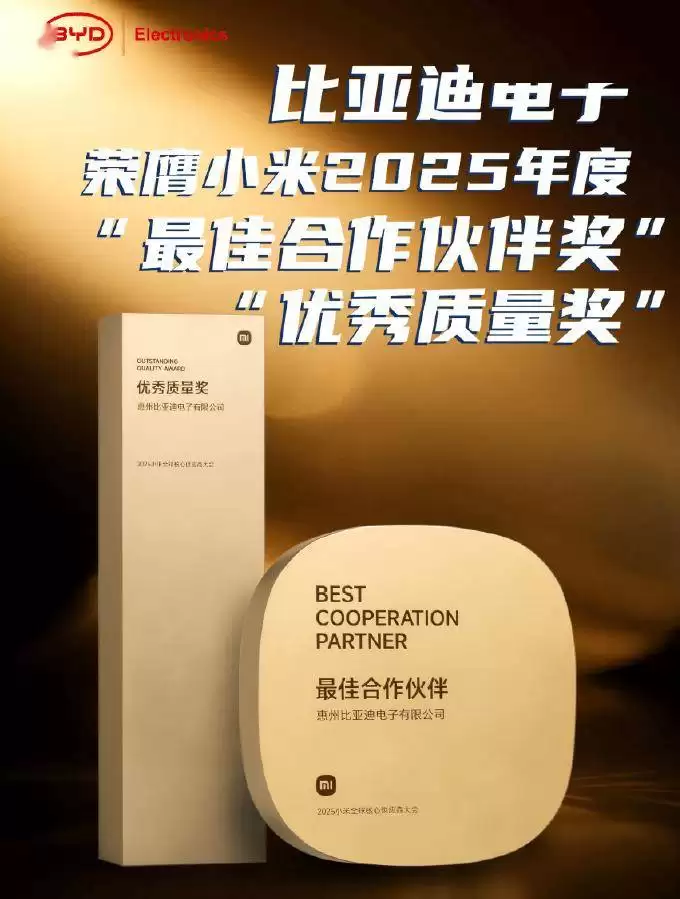 在近日举行的小米全球核心供应商大会上,比亚迪电子凭借其卓越的合作表现与可靠的产品质量,一举斩获“最佳合作伙伴奖”及“优秀质量奖”两项殊荣。这一成就不仅延续了双方多年来紧密的合作关系,更凸显出两家企业在科技领域协同发展的深厚根基。