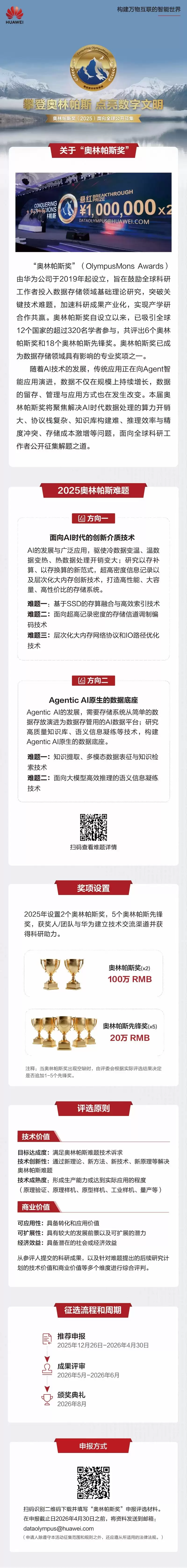 12月26日,华为数据存储官方透露,近期,华为正式启动面向全球的“2025奥林帕斯奖难题征集”活动,总奖金额高达300万元。本届奥林帕斯奖聚焦两个关键方向:其一,关注AI时代的创新介质技术;其二,探索面向Agentic AI原生的数据底座。