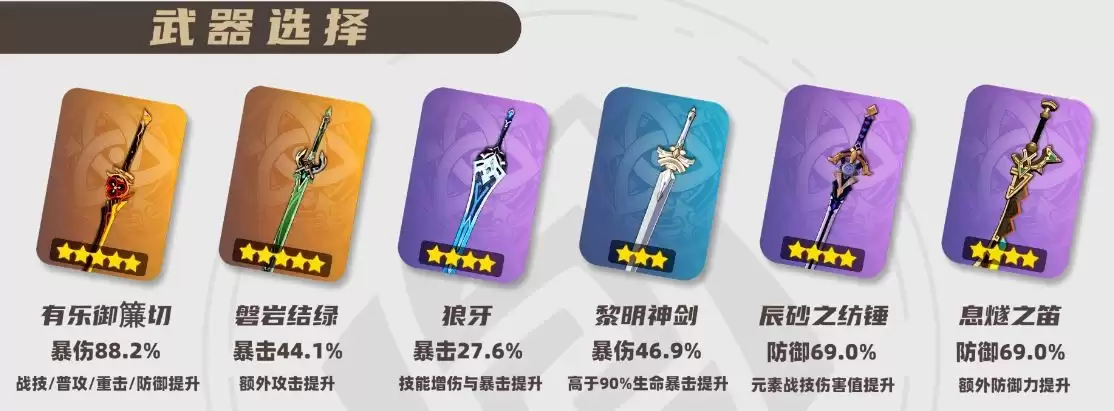 武器方面可以考虑【有乐御簾切】(提升战技伤害与防御力)、【磐岩结绿】(高额暴击加成与额外攻击力提升)、【狼牙】(提升战技/大招伤害与暴击率)、【辰砂之纺锤】(提升战技伤害)以及【黎明神剑】(需要生命值保持在90%以上)等;此外,【裁叶萃光】(高额暴伤加成)、【波乱月白经津】(暴击率与元素伤害加成,但其特效更侧重于普攻伤害提升)等依赖较高面板和属性加成的武器,也同样表现不俗。
