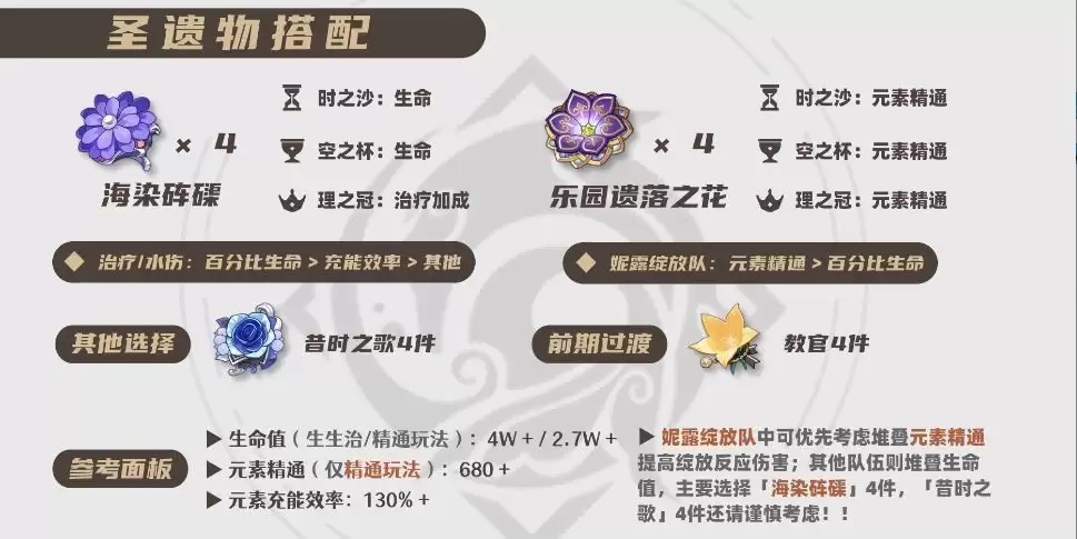 除了精通玩法外,其余两种流派的圣遗物套装优先考虑「海染砗磲」4件套;精通玩法则可选择「乐园」4件套或「2精通+2精通」等搭配方案。