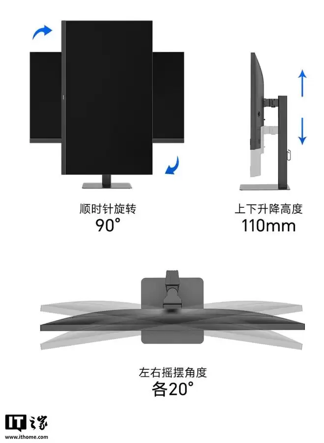 这款显示器的支架功能齐全,支持升降、倾斜及旋转调节。显示器本体兼容VESA 100x100mm标准壁挂接口,并提供了VGA与HDMI两种视频输入接口。