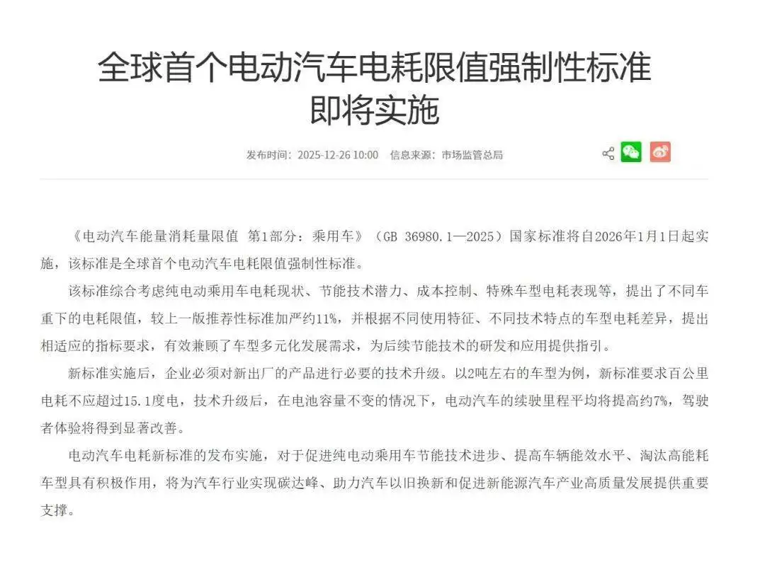 市场监督管理总局近日正式发布了《电动汽车能量消耗量限制第1部分:乘用车》强制性标准,该标准将于2026年1月1日起全面实施。作为全球首个针对电动汽车电耗的强制性规范,新标准在综合考量纯电动乘用车现有电耗水平、技术升级潜力、成本控制需求以及特殊车型性能表现的基础上,制定了基于不同整车质量的电耗限值体系。与现行推荐性标准相比,新规的限值要求严格了约11%,并针对不同使用场景和技术路线的车型设置了差异化指标。
