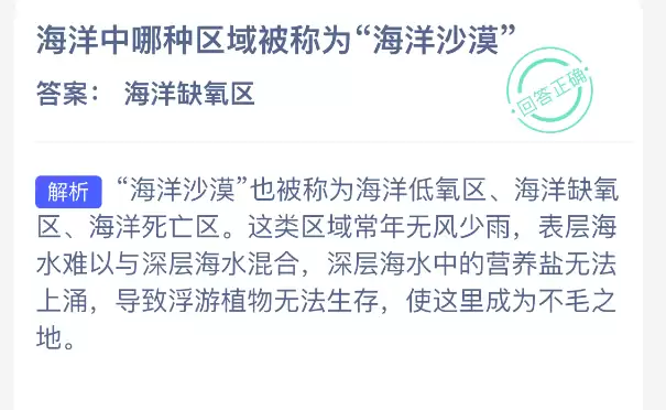在广袤的海洋中,哪个区域被形象地称作“海洋沙漠”?来自《神奇海洋》的12月26日全新题目现已揭晓答案!这道题的正确选项已经公布,点击页面即可领取拼图奖励,让我们共同为修复海洋生态贡献自己的一份力量吧!今天这道题的标准答案是:【海洋缺氧区】。“海洋沙漠”这一说法,通常也被称为海洋低氧区、海洋缺氧区或海洋死亡区。