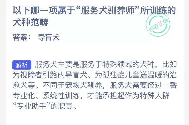 支付宝蚂蚁新村答案:服务犬驯养师训练犬种范围解析