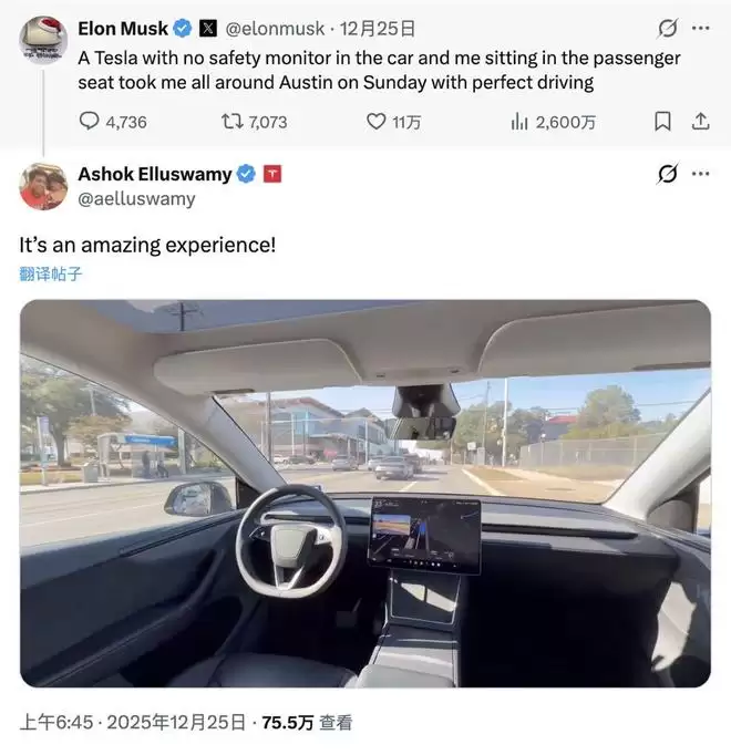 马斯克称此次试乘为「完美驾驶」,埃鲁斯瓦米从后排发布第一视角视频,形容体验为「Amazing(令人惊叹)」。马斯克同时确认,奥斯汀正开展「无人车、无乘客」的道路测试。