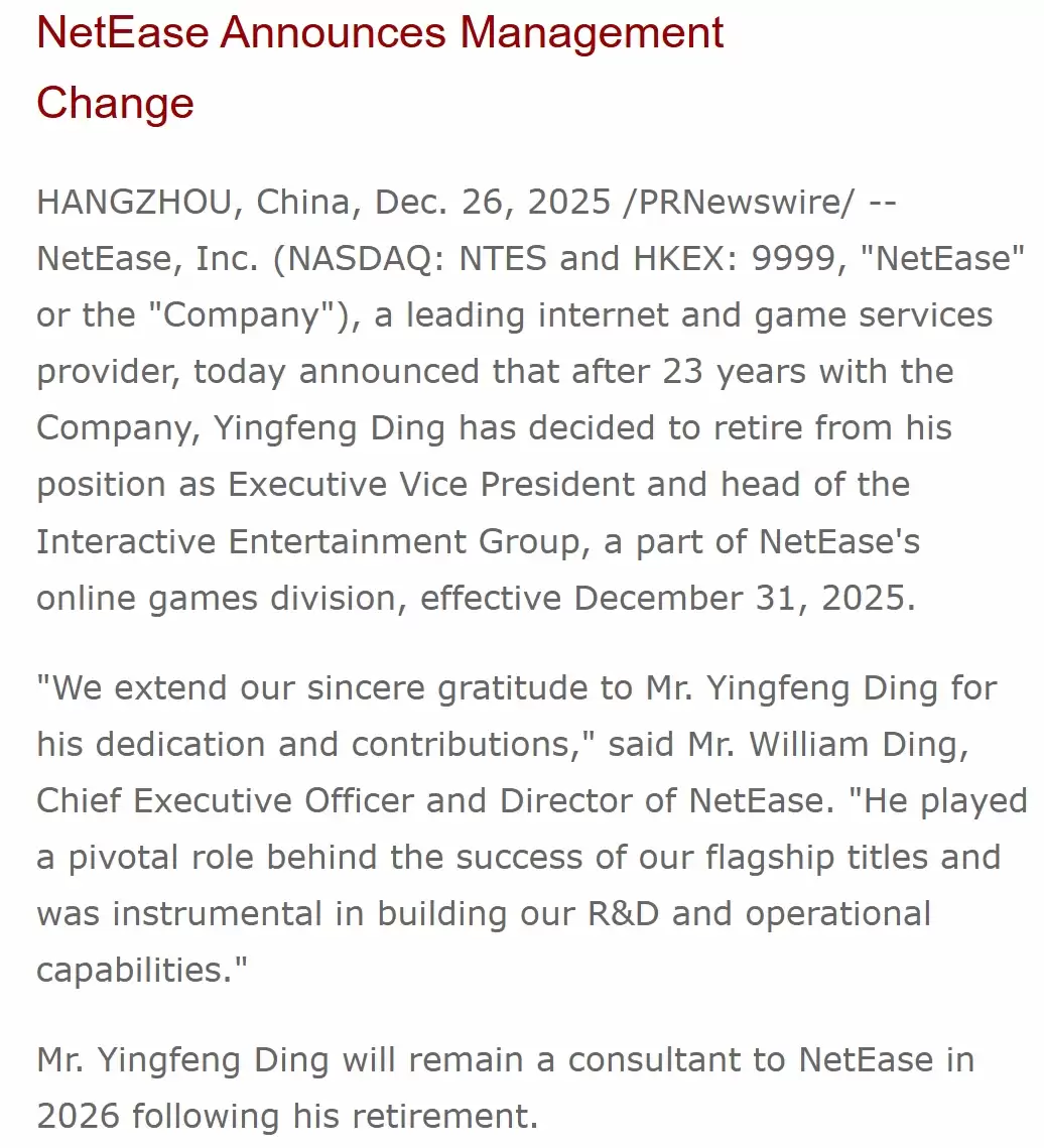 北京时间12月27日凌晨(美股交易日期间),网易集团发布公告,宣布集团执行副总裁、互动娱乐事业部负责人丁迎峰(丁丁)将于2025年12月31日正式退休。此后他将续任公司顾问一职。