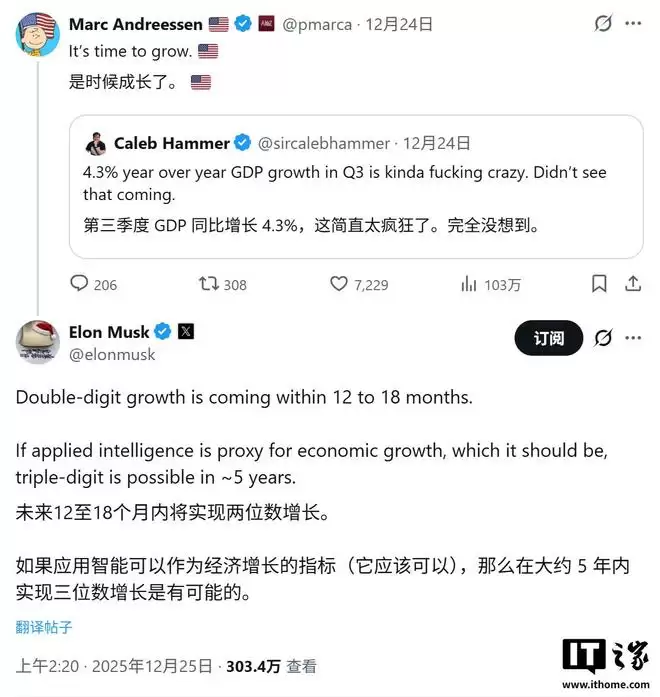 美国经济分析局最新数据显示,第三季度美国 GDP 年化增长率达 4.3%,风险投资家马克·安德森(Marc Andreessen)提出“增长时刻已至”的言论。