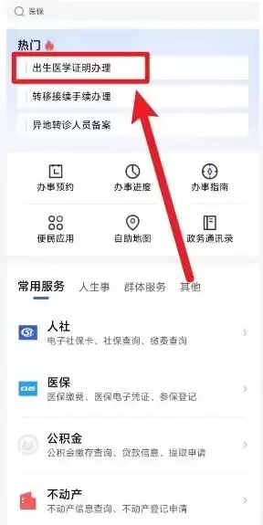 第二步:在展开的服务页面中,找到并点击【出生医学证明办理】入口。