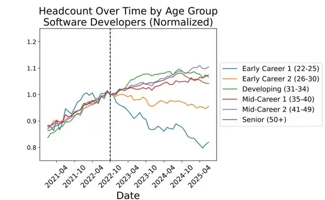 数据显示,年轻和年长开发者的就业情况直到2024年底是一致的。但从那时起,两者开始分化——年轻开发者开始失业,而年长开发者则没有。
