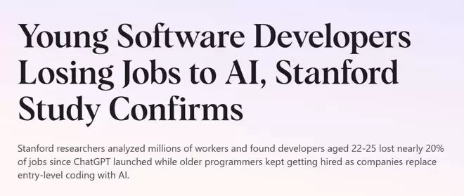 而斯坦福大学的研究发现,自从2024年底AI工具的普及,22至25岁的程序员就业率下降了近20%。