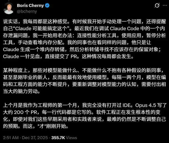 Anthropic工程师Boris Cherny在他的评论下说:自己现在每周都会这么觉得。