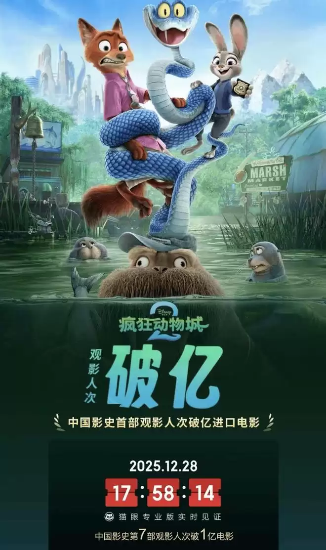 猫眼专业版数据显示,截至2025年12月28日晚,《疯狂动物城2》上映33天,累计观影人次突破1亿大关。这使它成为中国影史首部观影人次过亿的进口电影,同时也是中国影史第7部达成此成就的影片。