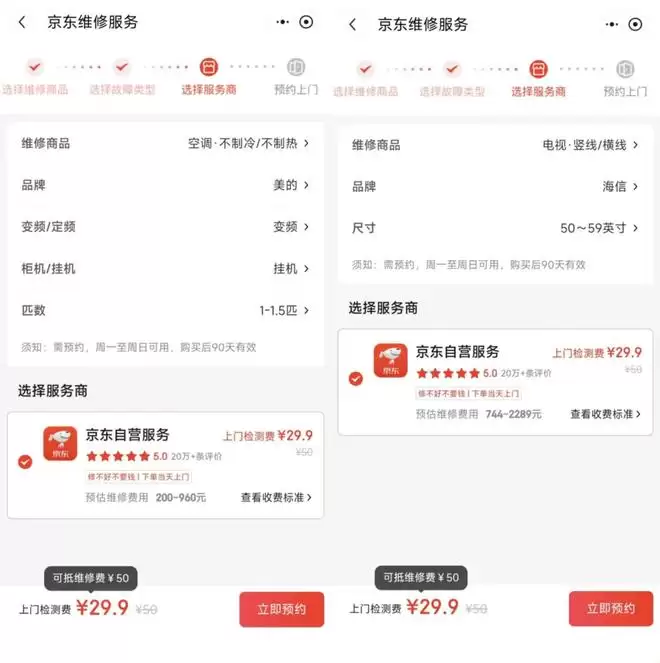 雷科技尝试点了几个品类的产品故障售后需求,均显示上门检测费为 50 元(系统自动发放的优惠券抵扣后,实际上门检测费为 29.9 元),同时可抵维修费 50 元,相当于后续开展的上门检测部分实际是「免费」的。与此同时,平台会给出预估维修费用的价格区间,用户心里也可以提前有个底。