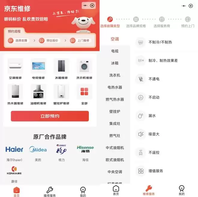 雷科技在京东平台的「京东维修」小程序中发现,目前其原厂合作品牌,包括海尔、美的、格力、海信、康佳等,目前支持的维修服务品类包括空调、电视、冰箱、洗衣机、电热水器/燃气热水器/壁挂炉、集成灶/燃气灶、中式油烟机/欧式油烟机、中央空调、灯具维修、电路维修、简易管道疏通等。