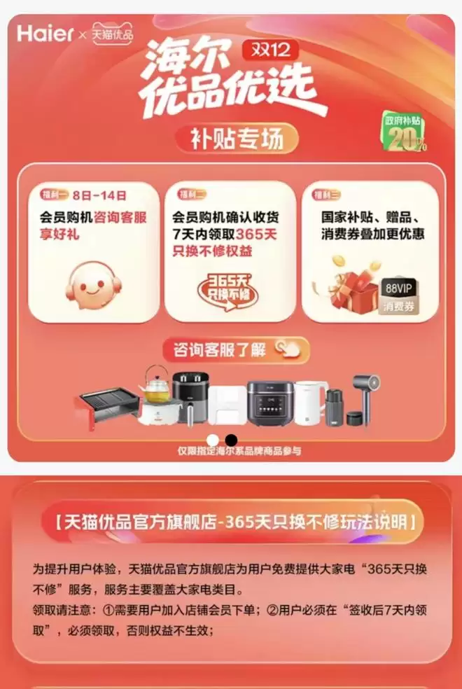 在天猫优品最新旗舰店,雷科技看到还在开展的「海尔优品优选」补贴专场,其中一大「福利」就是天猫优品会员可在购机确认收货 7 天内免费领取 365 天「只换不修」权益。