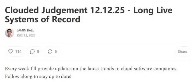 博客链接:https://cloudedjudgement.substack.com/p/clouded-judgement-121225-long-live
