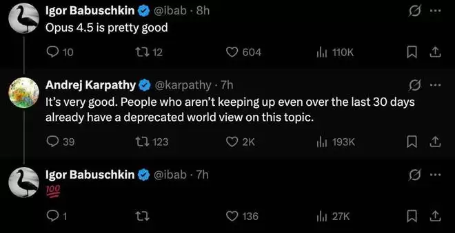 X 联合创始人 Igor Babuschkin 在评论区点名表扬竞争对手 Claude Opus 4.5 表现出色,Karpathy 回应道,AI 进化太快了,过去 30 天没跟上的人,观点就已经过时了。