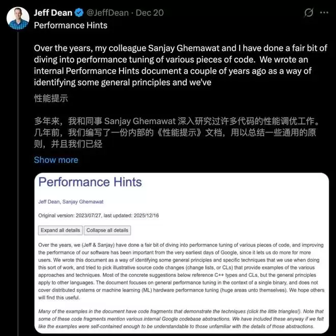 就在这种氛围下,Google的传奇工程师Jeff Dean更新了一份老文档:Performance Hints。
