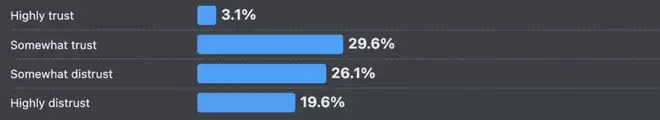 明确表示「不信任」AI准确性的开发者远多于「信任」的开发者,而表示「高度信任」的仅占3.1%。