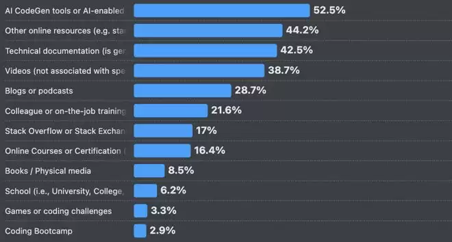 以上调研数据显示,开发者是一个即便在AI辅助下,依然需要持续高强度学习的群体。