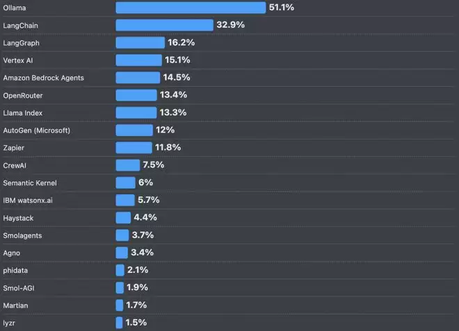 目前,智能体编排领域由开源工具主导。Ollama(51.1%)和LangChain(32.9%)是使用率最高的框架。