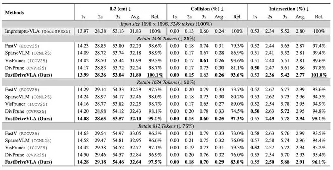 实验数据显示,在将视觉Token剪枝25%的情况下,FastDriveVLA在L2轨迹预测误差和路面边界交集率等核心指标上,超过了未经过任何剪枝的完整模型。