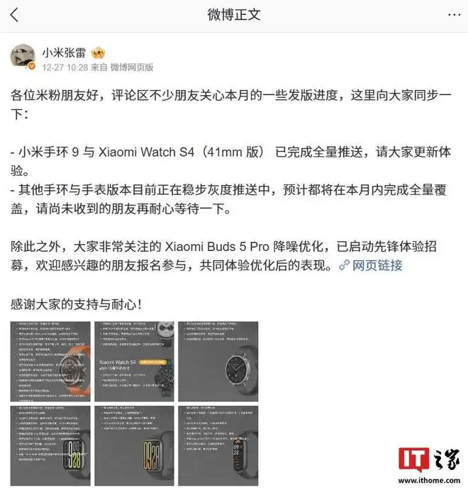 IT之家 12 月 28 日消息,小米集团手机部副总裁、可穿戴部总经理张雷昨日发布了穿戴类设备的发版进度,其中提到小米手环 9 与 Xiaomi Watch S4(41mm 版)已完成全量推送;其他手环与手表版本目前正在稳步灰度推送中,预计都将在本月内完成全量覆盖。