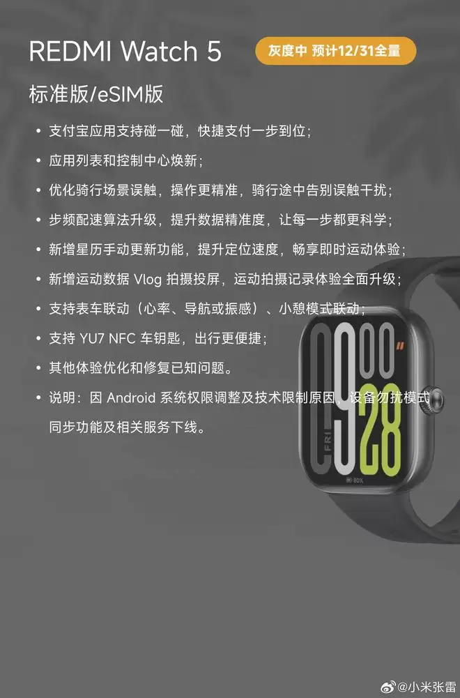 发版进度 灰度中,预计 12/31 全量更新内容 支付宝应用支持碰一碰,快捷支付一步到位; 应用列表和控制中心焕新; 优化骑行场景误触,操作更精准,骑行途中告别误触干扰; 步频配速算法升级,提升数据精准度,让每一步都更科学; 新增星历手动更新功能,提升定位速度,畅享即时运动体验; 新增运动数据 Vlog 拍摄投屏,运动拍摄记录体验全面升级; 支持表车联动(心率、导航或振感)、小憩模式联动; 支持 YU7 NFC 车钥匙,出行更便捷; 其他体验优化和修复已知问题。 说明:因 Android 系统权限调整及技术限制原因,设备勿扰模式同步功能及相关服务下线。