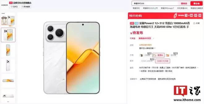 IT之家注意到,荣耀Power2现已在京东平台开启预约。新机提供12GB+256GB和12GB+512GB两种存储规格,具体售价暂未公布。