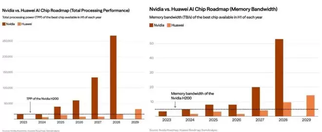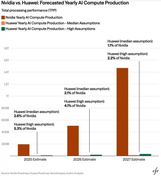 除上述外,如CFR报告所言,华为及其国内同行还面临美国对先进封装(CoWoS)和HBM3e供应链的严密封锁,使得到2027年,随着Blackwell系列的全面普及,英伟达顶配芯片的性能预计将达到华为同期昇腾芯片的17倍,集群算力差距更可能拉大到21—49倍。而正是这种“领先一个身位”的策略,实质上是将中国锁死在“逻辑上能运行、工程上难超越”的次级算力圈层中。