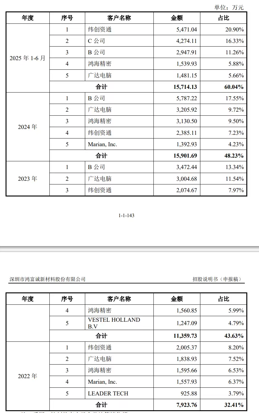 鸿富诚的前五大客户情况如下: