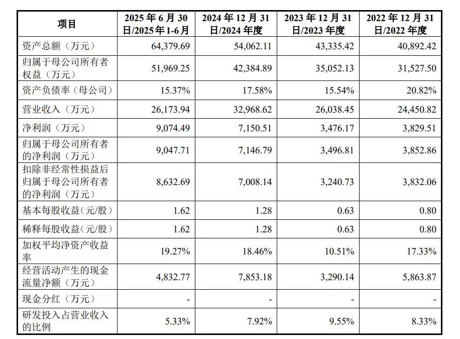 报告期内(2024年至2025年上半年),鸿富诚的营业收入分别为2.45亿元、2.6亿元、3.3亿元、2.62亿元;净利润分别为3829.51万元、3476.17万元、7150.51万元、9074.49万元。