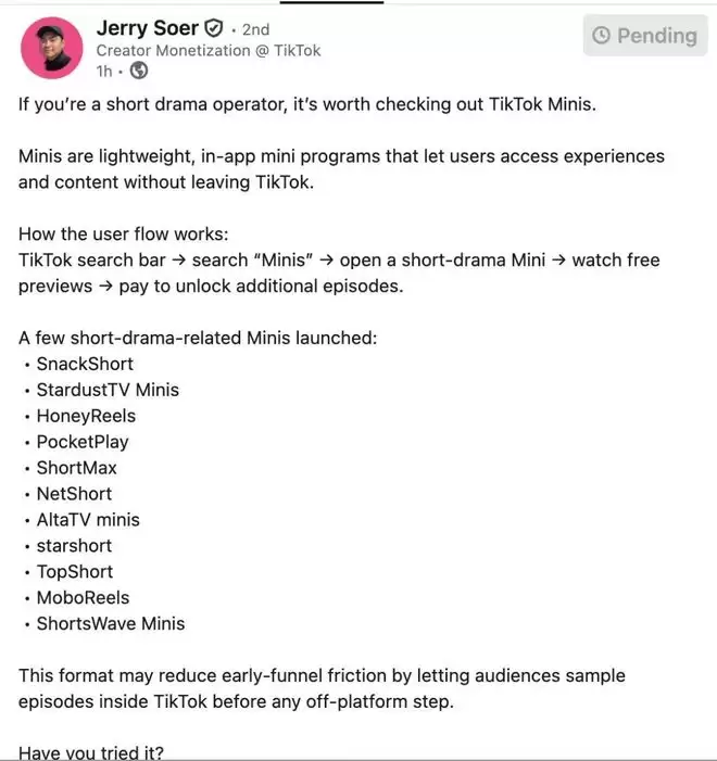 TikTok 的 Jerry Soer 近期在 LinkedIn 上发布了关于该功能的帖子。