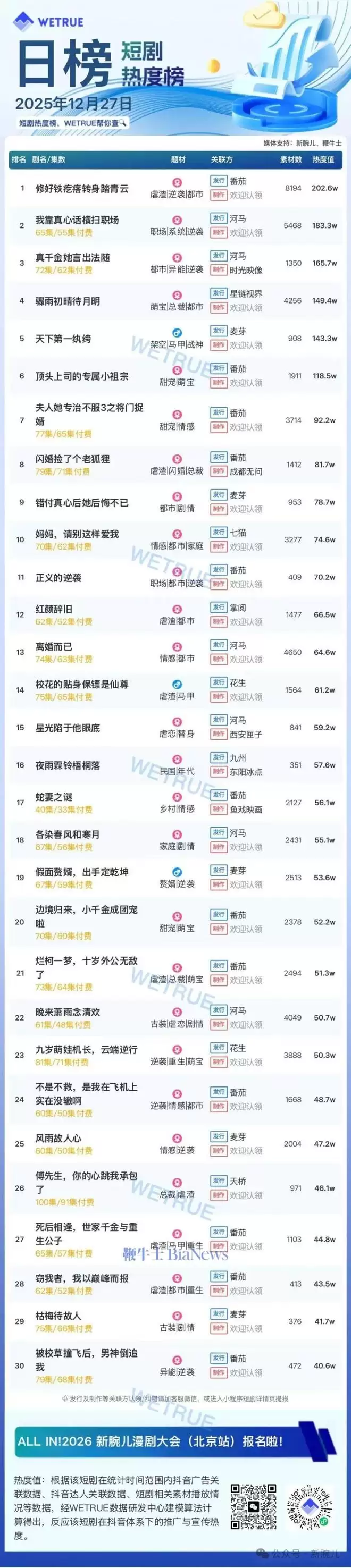 27日短剧热度榜:《修好铁栅栏转身踏青云》夺冠,大盘热力超4251万