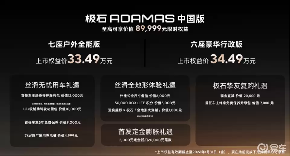 作为极石品牌全球化战略的集大成之作,全新旗舰ADAMAS围绕“感官、驾驶、智能、户外”四大体验维度进行全面升级,为用户带来全场景“丝滑”豪华体验。在感官层面,以沙漠落日为灵感推出全新外观色流沙金,六座版配备顶级Nappa真皮包裹的二排零重力座椅,最大躺角达150°,带来超越头等舱的顶级享受;七座版拥有183mm的超宽中央通道,完美平衡7人乘坐与二排便利进出的需求。同时,标配超豪华品牌同源超纤绒顶棚,营造出沉浸式豪华氛围。驾驶层面,搭载140mm超长行程空气悬挂,具备强悍越野性能,获得中汽研L3级进阶越野能力认证;配合极石自研的DCC智能阻尼控制系统,实现精细底盘调校,带来媲美豪华轿车的公路舒适性。智能体验上,全新语音助手“小石头”融合DeepSeek等行业领先的AI大模型,轻松理解多重指令,配合成熟的L2+级辅助驾驶系统,显著提升交互效率与行车安全。户外场景中,集成最大5.7kW的超高对外放电能力、露营自动调平模式、尾门户外餐吧2.0等系统性生态,让车辆化身功能完备的“移动起居室”,无缝衔接城市通勤与荒野探索。