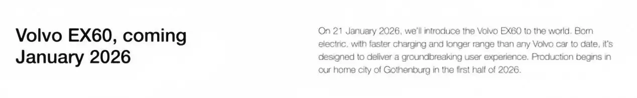 沃尔沃EX60将于1月21日上市 SPA3平台打造续航超700公里