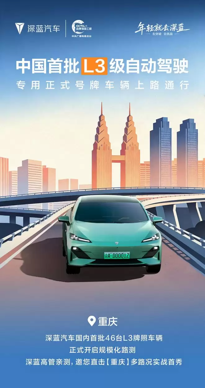 12月26日,中国首批搭载L3级自动驾驶专用正式号牌的车辆,在重庆开始了规模化上路通行。本次上路的车辆共46辆,均为搭载了L3级自动驾驶系统的长安深蓝汽车。这批车辆获准在重庆市内环快速路、新内环快速路(高滩岩立交 — 赖家桥立交)以及渝都大道(人和立交 — 机场立交)路段开展上路通行测试。