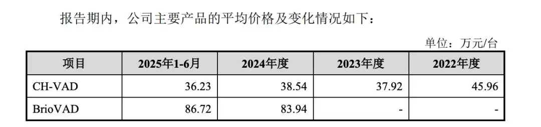 报告期内,公司产品价格整体较为稳定,2022年、2023年、2024年及2025年上半年,CH-VAD的平均价格分别为45.96万元、37.92万元、38.54万元以及36.23万元。CH-VAD 售价有所下调,主要系公司在国内人工心脏行业高速发展期快速拓展客户,不断提高市场占有率,为建立稳固的客户基础而主动调整价格。
