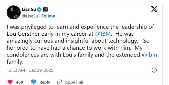 IBM 现任董事长兼 CEO 阿尔温德·克里希纳(Arvind Krishna)在悼念信中写道,郭士纳在 IBM 前途未卜的时刻临时上任,其领导力源于对客户未来需求坚持不懈的专注。作为一名前 IBMer,AMD 董事长兼 CEO 苏姿丰在社交媒体上写道:“我有幸在自己在 IBM 的职业生涯早期见识并体验了路易斯·郭士纳的领导力。他对技术有着惊人的好奇心和深刻的洞察力。能有机会与他共事,我倍感荣幸。我向郭士纳的家人和 IBM 大家庭致以深切慰问。”