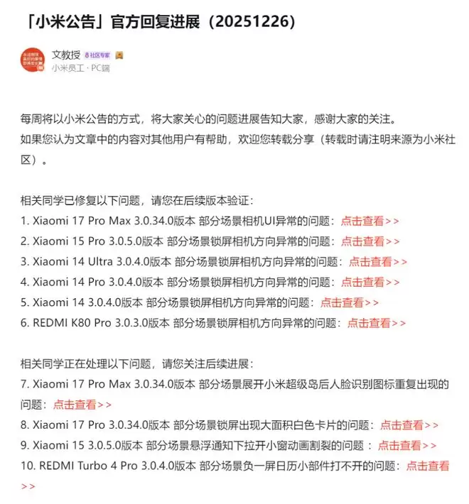 同时,公告列出了四个仍在处理中的问题:Xiaomi 17 Pro Max展开超级岛后人脸识别图标重复、Xiaomi 17 Pro锁屏出现大面积白色卡片。